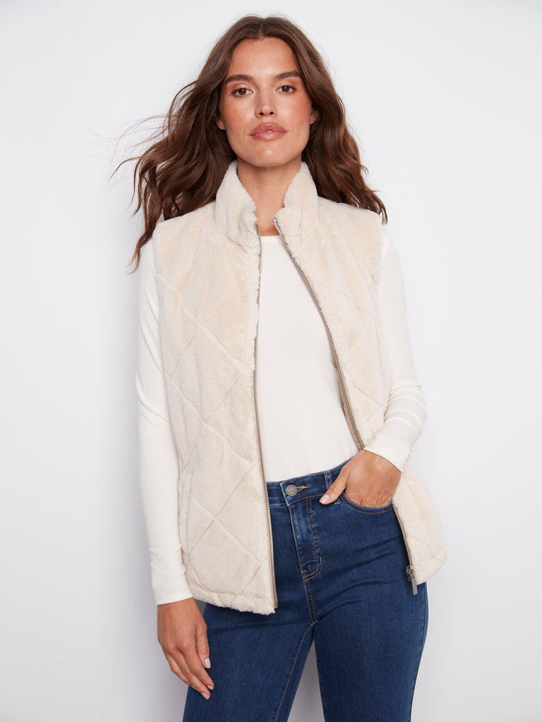 Solid Reversible Quilted Faux Fur Nylon Vest With Welt Pockets