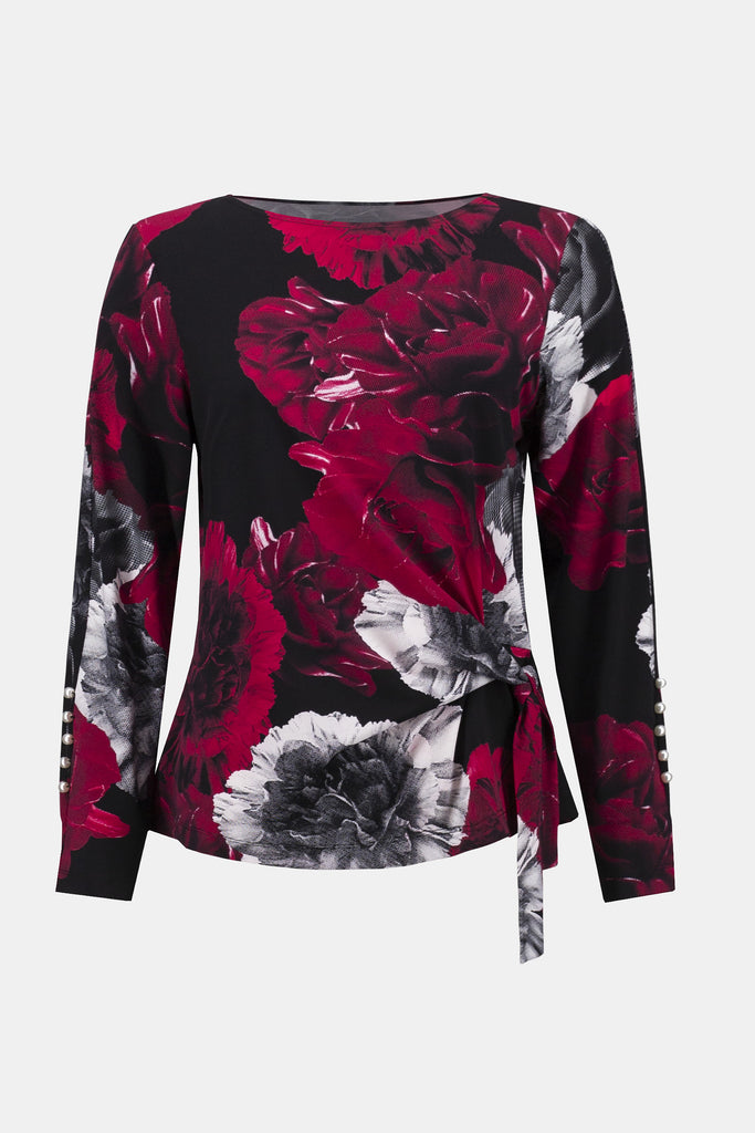 Flaunt your passion for unique design in this exquisite silky knit top. The piece pairs a captivating floral print to a charming fitted silhouette to create a perfectly polished look. The boat neckline and long sleeves with pearl buttons add sophistication while the sleek tie at the waist offers a delicate finishing touch.