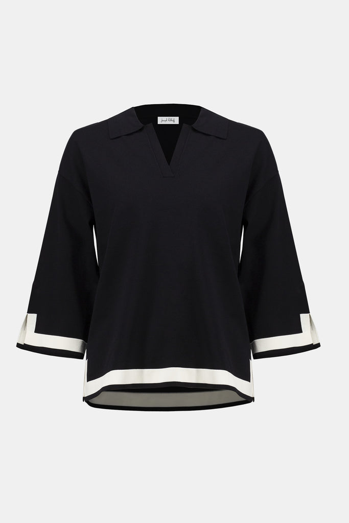 This sweater knit top gets a modern twist with contrast tipping, creating a subtle colour-block effect. A polo-style shirt collar, V-neckline, and three-quarter bell sleeves complete the design, striking the perfect balance of cozy and chic.